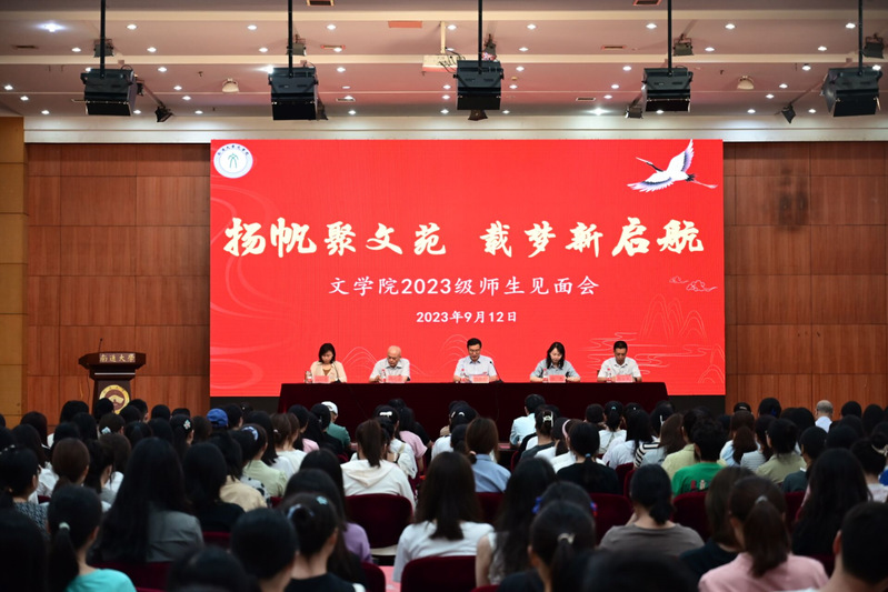 9月12日上午,熟女视频 在大学生活动中心举办以“扬帆聚文苑,载梦新启航”为主题的2023级师生见面会。