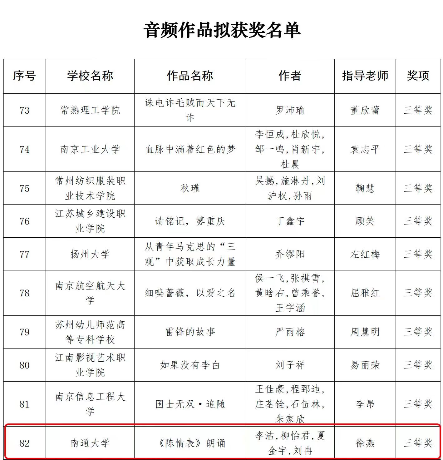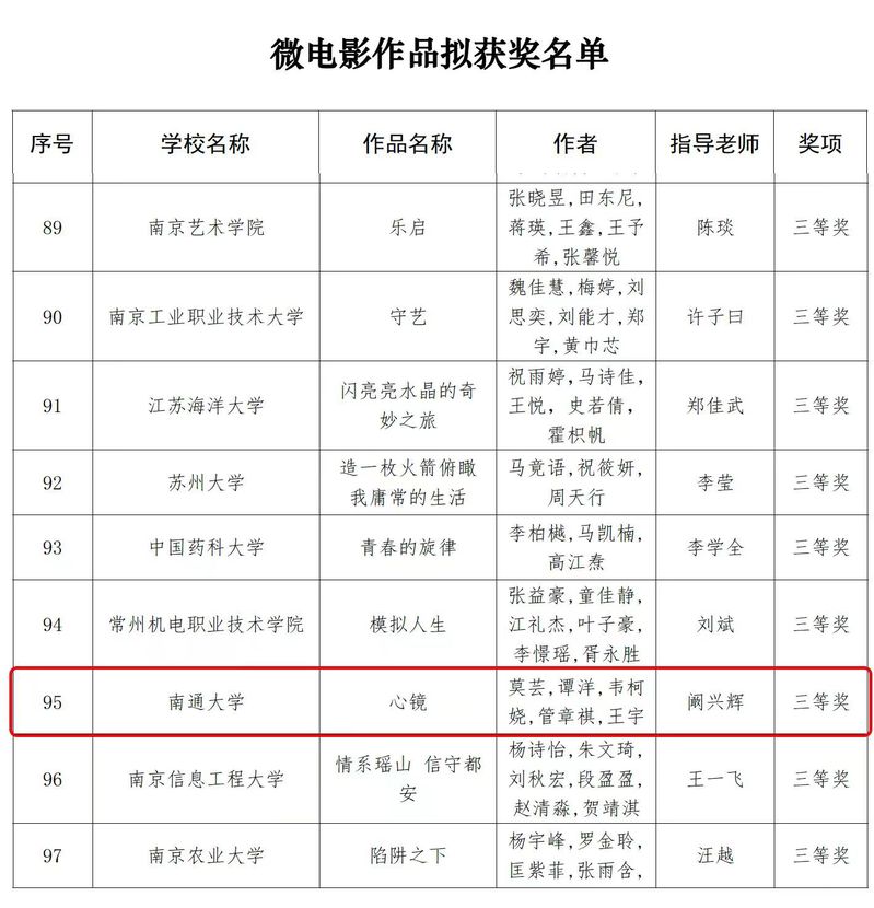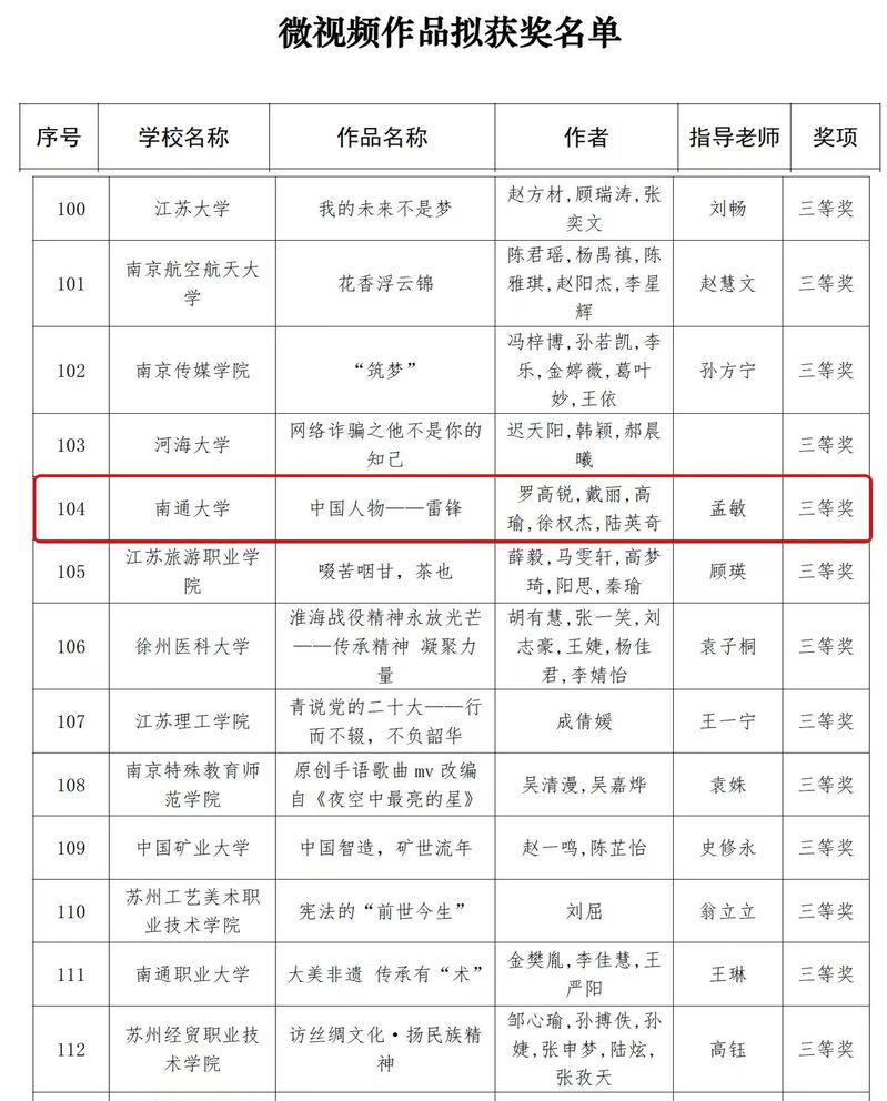 近日,江苏省委教育工委、江苏省教育厅公布了2023年江苏省大学生网络文化节和高校网络教育优秀作品推选展示活动遴选结果。经过高校申报、材料初审、专家评审,熟女视频 共三项作品在江苏省大学生网络文化节中取得佳绩,微视频作品《中国人物—雷锋》荣获微视频类三等奖,微电影作品《心镜》荣获微电影类三等奖,音频作品《陈情表》荣获音频作品类三等奖。
